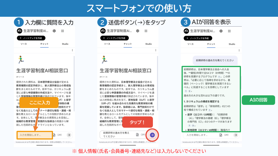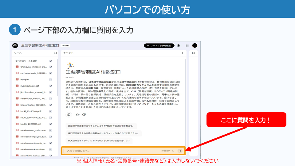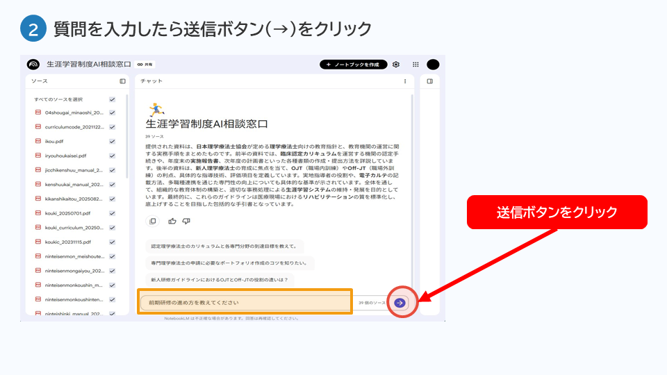 日本理学療法士協会および千葉県理学療法士会が公開している生涯学習関連の資料・情報をもとに、Google NotebookLM(AI技術)を活用して回答を生成しています。